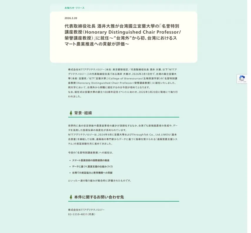 最先端農業用ハウスの設計・施工 完全閉鎖循環式陸上養殖 遠隔営農支援 遠隔営農支援 農総研との共創 事業内容 導入事例 企業情報 採用情報 取扱商品 AGRI TOPICS 代表取締役社長 酒井大雅が台湾國立宜蘭大學の「名誉特別講座教授(Honorary Distinguished Chair Professor/榮譽講座教授)」に就任~“台湾外”から初、台湾におけるスマート農業推進への貢献が評価~ 代表取締役社長 酒井大雅が台湾國立宜蘭大學の「名誉特別講座教授(Honorary Distinguished Chair Professor/榮譽講座教授)」に就任~“台湾外”から初、台湾におけるスマート農業推進への貢献が評価~ 台湾・南澳における遠隔営農支援システムの実証結果を発表~対面指導が困難な地域での新規作物に関する栽培指導の有効性を確認~ 台湾・南澳における遠隔営農支援システムの実証結果を発表~対面指導が困難な地域での新規作物に関する栽培指導の有効性を確認~ 国連訓練調査研究所(ユニタール)から感謝状を拝受しました 国連訓練調査研究所(ユニタール)から感謝状を拝受しました ドライフルーツの人気の秘密を開発者に聞きました。 ドライフルーツの人気の秘密を開発者に聞きました。 AGRI-TECHで、地域を次世代へ わたしたちは、食と農の分野において、新たな可能性と価値を見出し、持続可能で豊かな社会を創ります。 幅広い事業領域 育種、次世代施設園芸の設計・施工、産品の加工・販売まで地域のみなさま、ビジネスパートナーと共に農業界の発展に向けて取り組んでいます。 食と農のバリューチェーン 種子開発 育種 TOP 1次 生産 TOP 2次 加工・流通 TOP 3次 販売・消費 ※株式会社農業総合研究所がスーパーマーケット内に展開する「農家の直売所」 TOP 事業一覧はこちら ※株式会社農業総合研究所がスーパーマーケット内に展開する「農家の直売所」 それぞれの事業で食と農のバリューチェーンの最適化を図り、 食糧の安定供給をめざします。 食と農のさまざまな課題に挑戦しています スマート農業でお悩みはありませんか? 圃場の労務管理が大変・・・ 広大な圃場のリアルタイムな進捗管理が難しい スマート農業、どうやって始めればいい? NTTアグリテクノロジーのDigitalFarmerをご提案します。 くわしくみる 鮮度の保持でお悩みはありませんか? 農産物の鮮度保持が難しい… 飲食店でのフードロスを削減したい 農産物の出荷調整で収益安定させたい NTTアグリテクノロジーの電圧冷蔵ソリューションをご提案します。 くわしくみる お困りごとはございませんか? 他のお悩みはこちら 事業一覧 お知らせ・ニュースリリース 2026.3.20 リリース 代表取締役社長 酒井大雅が台湾國立宜蘭大學の「名誉特別講座教授(Honorary Distinguished Chair Professor/榮譽講座教授)」に就任~“台湾外”から初、台湾におけるスマート農業推進への貢献が評価~ 2026.3.20 リリース 台湾・南澳における遠隔営農支援システムの実証結果を発表~対面指導が困難な地域での新規作物に関する栽培指導の有効性を確認~ 2026.3.18 お知らせ 国連訓練調査研究所(ユニタール)から感謝状を拝受しました 2026.3.18 お知らせ 成長分野カンファレンスに当社が登壇しました さらに見る 採用情報 農業を起点とした街づくりの実現に向けて くわしくはこちら 採用情報 農業を起点とした街づくりの実現に向けて 詳細はこちら ページTOPへ