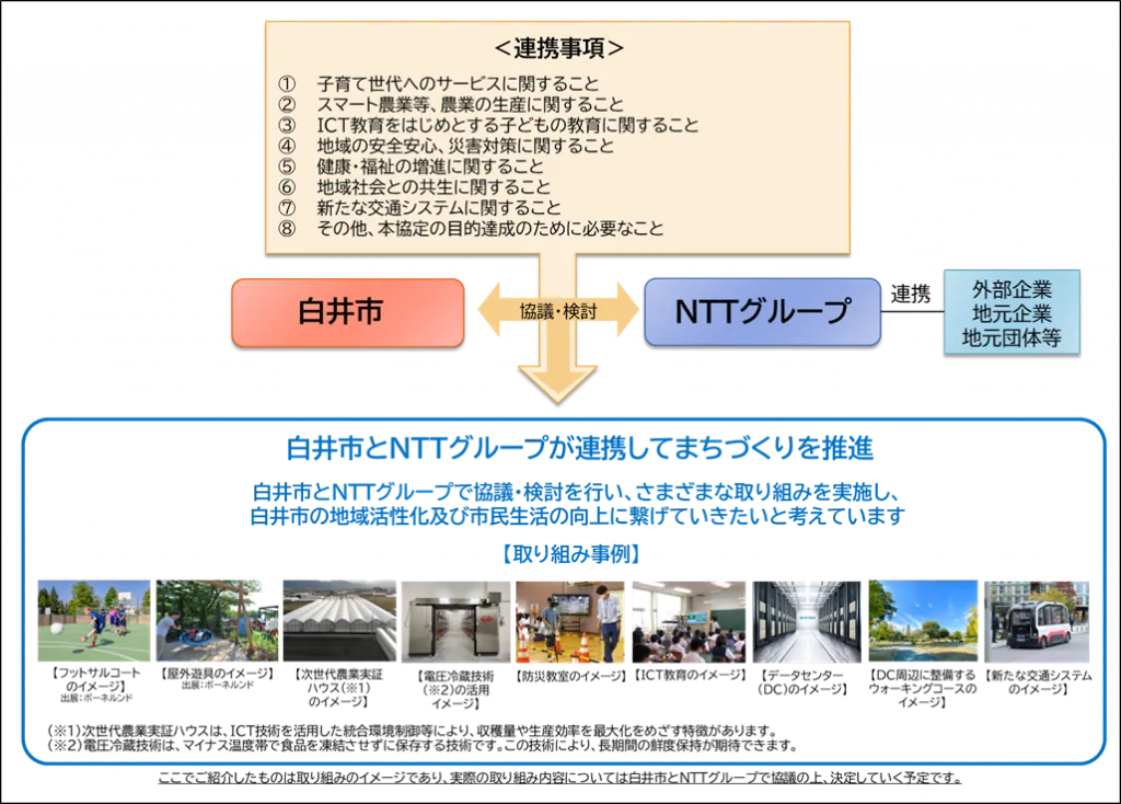 白井市は、第6次総合計画を行政運営の指針とし、人口減少や高齢化を見据えた持続可能で暮らしやすいまちづくりを推進しています。本協定は、NTTグローバルデータセンター・ジャパンによる白井市でのデータセンター開発を契機として、白井市とNTTグループ4社が、「デジタルインフラ」「農業」「まちづくり」を軸に、白井市の地域活性化に向けたさまざまな取り組みを推進することを目的としています。