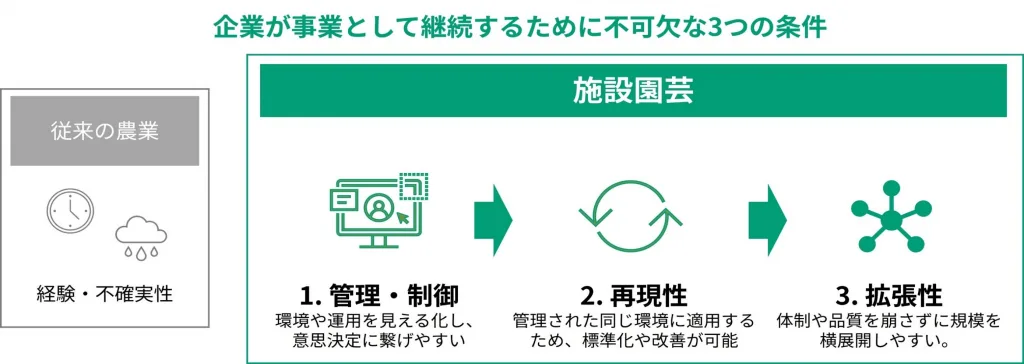 NTTアグリテクノロジーは、企業が農業を事業として継続するには、「管理(制御)性」「再現性」「拡張性」が重要だと考えています。これらの条件を満たしやすいのが、施設園芸(太陽光利用型植物工場)です。