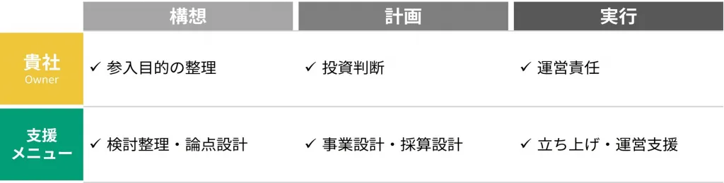 上記はあくまで代表的な例であり、実際には企業ごとに目的や強みは異なります。貴社のアセットを見つめ直し、事業として成立する形を設計するかが重要になります。これまでの経験をもとに、弊社も検討整理を支援します。