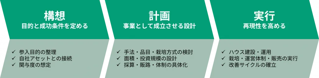 農業参入は、第4章で整理した通り、「構想・計画・実行」の各フェーズで進みます。